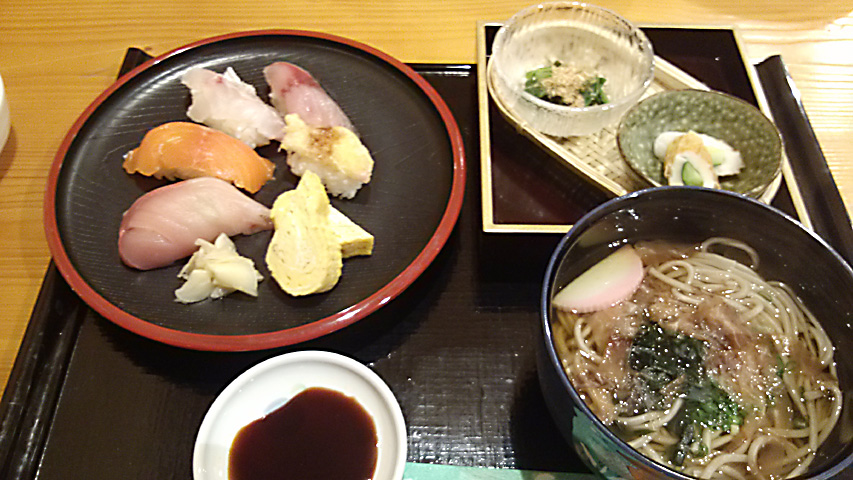 なんと、お寿司にぎり6貫と小鉢2品・越前そば付きで680円
