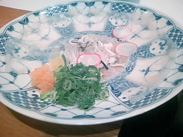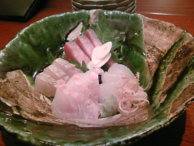 さしみ盛り、穴子の天婦羅、合鴨の塩焼き、鱈の白子しょうゆ焼き、黒めばるの煮付け、