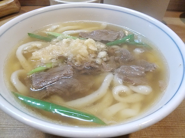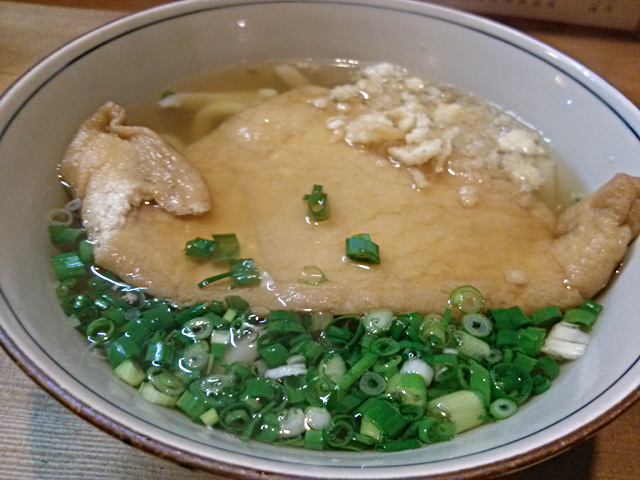 冷たいうどん・温かいうどん・釜揚げうどんとあって、温かいきつねと肉うどんを注文。