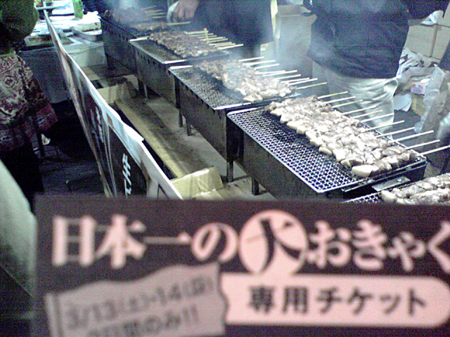 すごい人で座るところがないよ~やっと中央公園のところで座れたので、窪川の米豚串焼きをつまみに