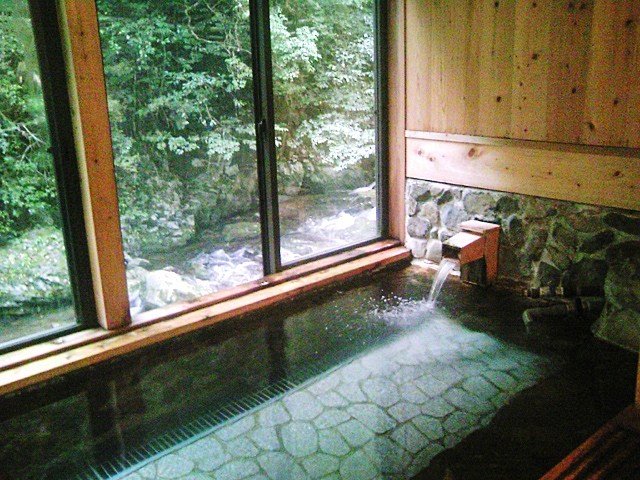 風呂の窓から渓流を眺めながら湯船に浸かってのんびり